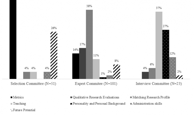 In the figure below I display the most important criteria used in the three different committees which the Norwegian academic recruitment processes consisted of. While metrics were the most important criteria in the selection committees, whose task it is to select eligible candidates, they were inferior when it came to the in-depth reading of the candidates’ work in the expert committees. Here, tenured professors evaluated the candidates according to disciplinary standards. Moreover, in the last stage of the recruitment process, when interviewing the highest ranked candidate, metrics were neglected as the focus for these interviews was to evaluate the candidates’ teaching experience and their social skills.