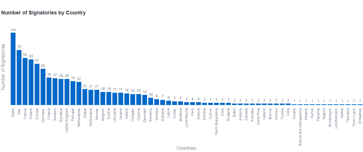 Bar charts allow comparisons of signatories across countries, along with both static and interactive maps of signatories.