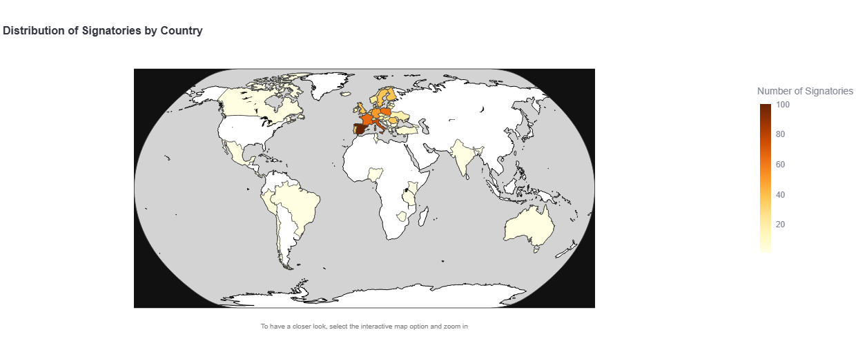 Last but not least, I continue working to improve the dashboard and make it even more useful for analysis. I also want to emphasize that the dashboard provides an overview of signatories, and for deeper analysis more research and additional data sources are required. When interpreting the data, factors such as the size of each country and its research system should be taken into account; therefore, comparing the proportion of signatories relative to non-signatories is often more informative than looking at absolute numbers.