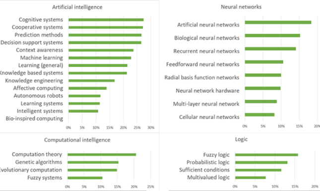 Those disciplines that discuss sustainable development in more than 20% of their production focus on cognitive and cooperative systems, prediction methods, decision support systems, and computation theory. Other disciplines, such as learning systems, bio-inspired computing, and autonomous robots, which are crucial for sustainable development, discuss it to a much lesser extent (see figure 1).