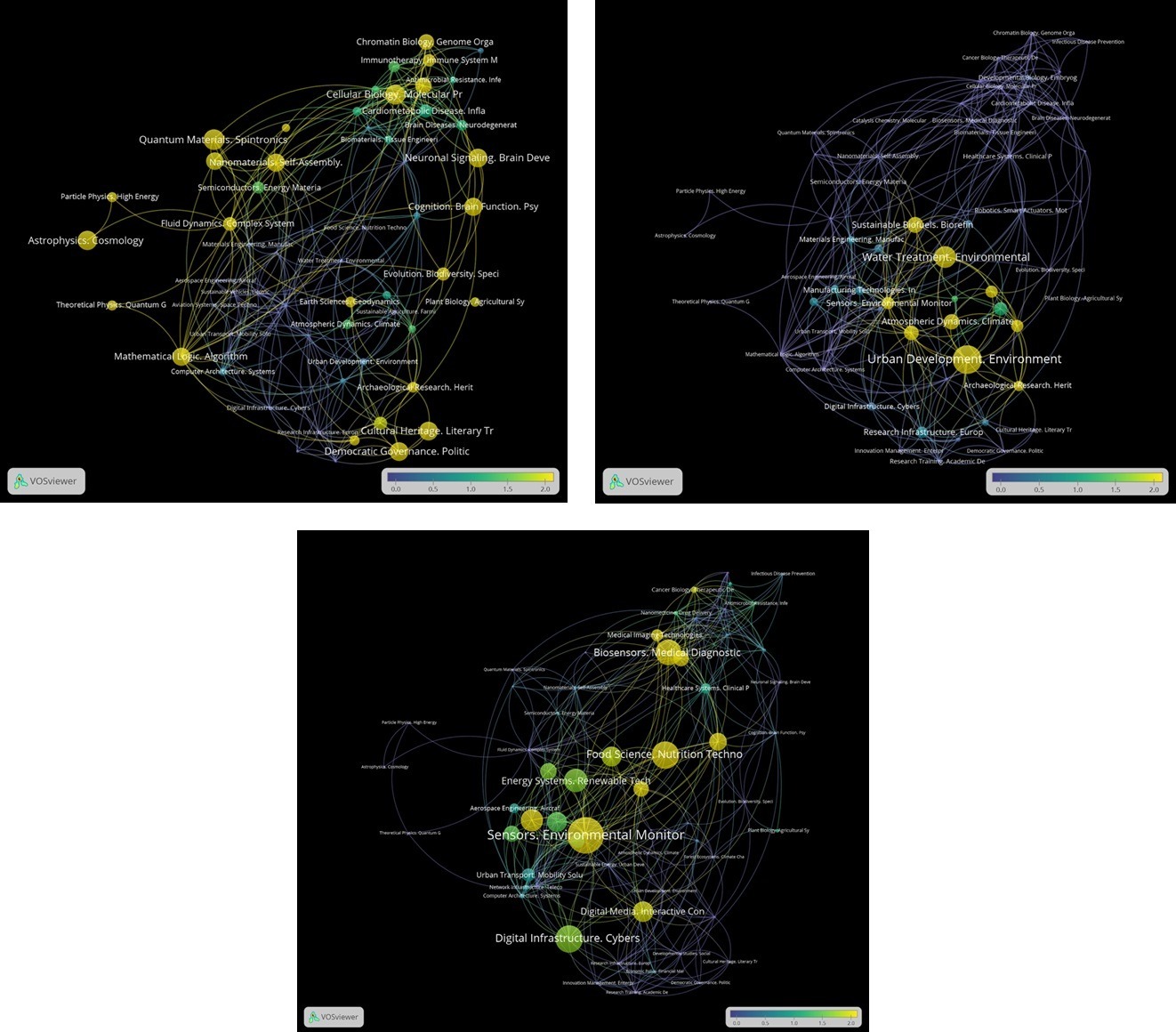 We have used the VOSviewer global map to visualise the disciplinary differences in funding between organisations, regions, and funders’ programmes. This includes six universities, including cases of comprehensive universities, as well as universities with technical, social science, and medical profiles; four European regions with different knowledge and economic specialisations; and various EC funding programmes. All of these are investigated separately, as illustrated in Figure 2. The size of the nodes is proportional to the relative funding obtained from EU grants for a given territory, not to the volume of funding. The colour scale indicates relative specialisation: yellow is high specialisation, green is no specialisation, and blue is low specialisation. All details can be found in the interactive map. Different entities can be investigated separately by selecting the respective items in the menu bar on the left of the VOSviewer map.